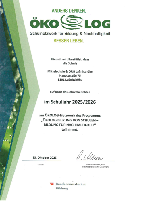 MS & ORG Laßnitzhöhe ist ÖKOLOG School, UNESCO School, FAIRTRADE School und School of Well-Being! Schon seit 2011 sind wir im ÖKOLOG-Netzwerk vertreten. ÖKOLOG fördert vielerlei Kompetenzen im ökologischen, sozialen und kulturellen Bereich. Im Rahmen der Schulentwicklung haben Schulen die Möglichkeit, ihre ÖKOLOG-Initiativen als selbstgewähltes Thema des Entwicklungsplans ihrer Schule